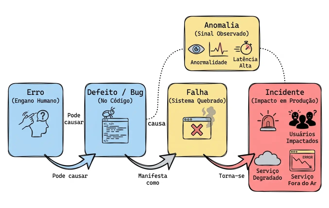 A imagem acima mostra a progressão mais comum de um problema em software. Tudo começa com um erro, ou seja, uma ação humana incorreta. Esse erro pode introduzir um defeito no código, na configuração ou até em outro artefato do sistema. Quando esse defeito se manifesta durante a execução, ele aparece como falha. Já a anomalia funciona como o sinal de que algo saiu do normal — seja por meio de logs, métricas, monitoramento ou percepção de usuários e times internos. Se esse problema passa a afetar serviço, operação ou negócio, aí entramos no terreno do incidente.